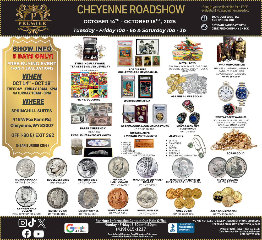 Oct 08, 2025. Premier Gold Silver & Coin - Cheyenne Roadshow Events Ads from Wyoming Tribune Eagle