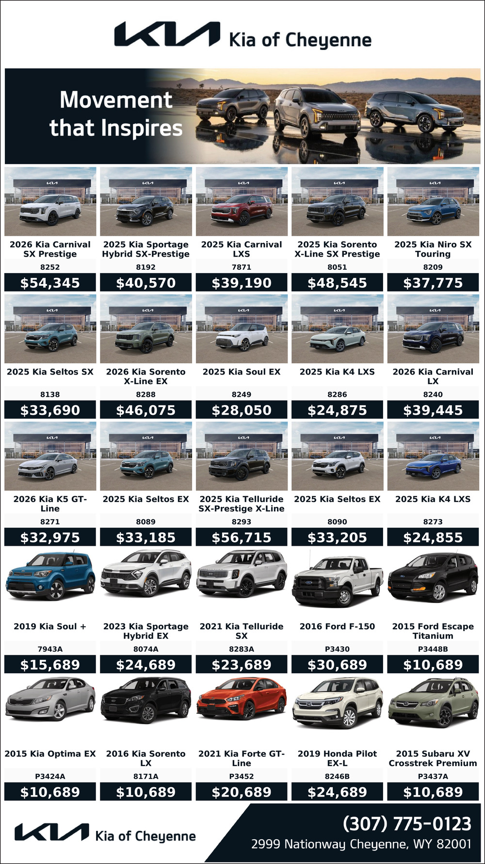 Oct 17, 2025. Kia of Cheyenne Auto Dealers Ads from Wyoming Tribune Eagle