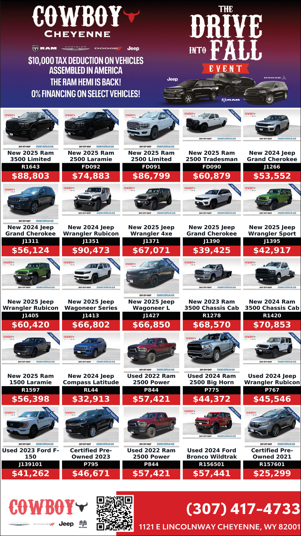 Oct 18, 2025. Cowboy Dodge Chrysler Jeep RAM Auto Dealers Ads from Wyoming Tribune Eagle