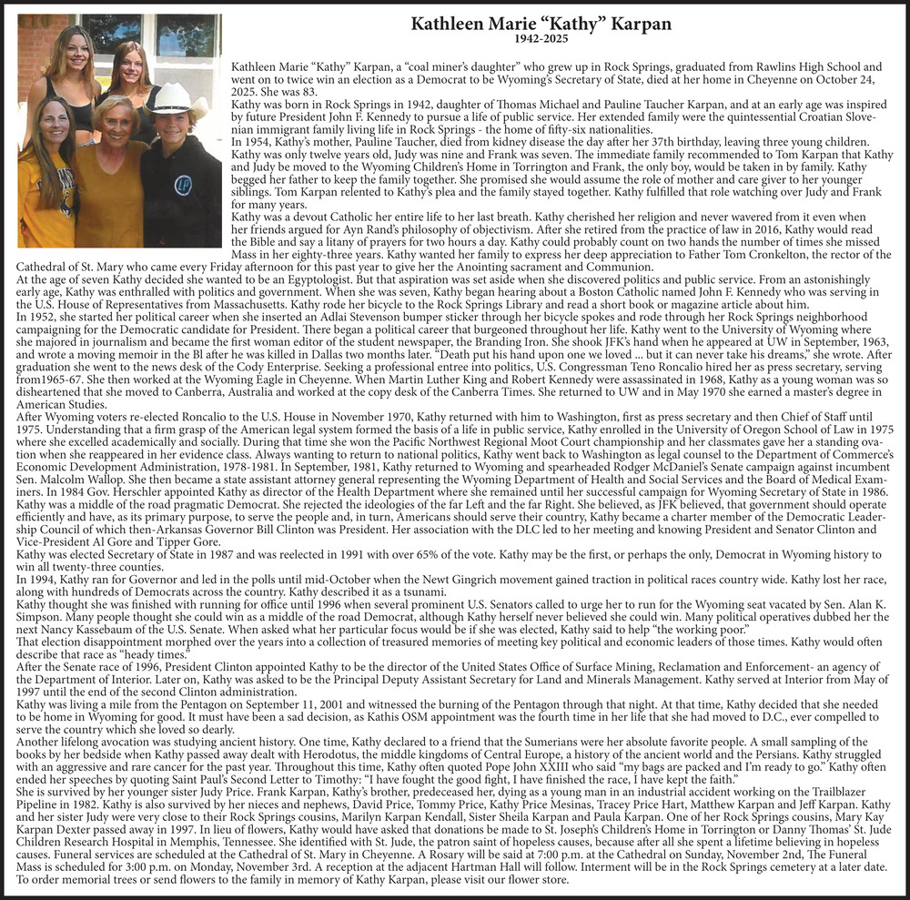Oct 31, 2025. Kathleen Marie "Kathy" Karpan Obituaries Ads from Wyoming Tribune Eagle