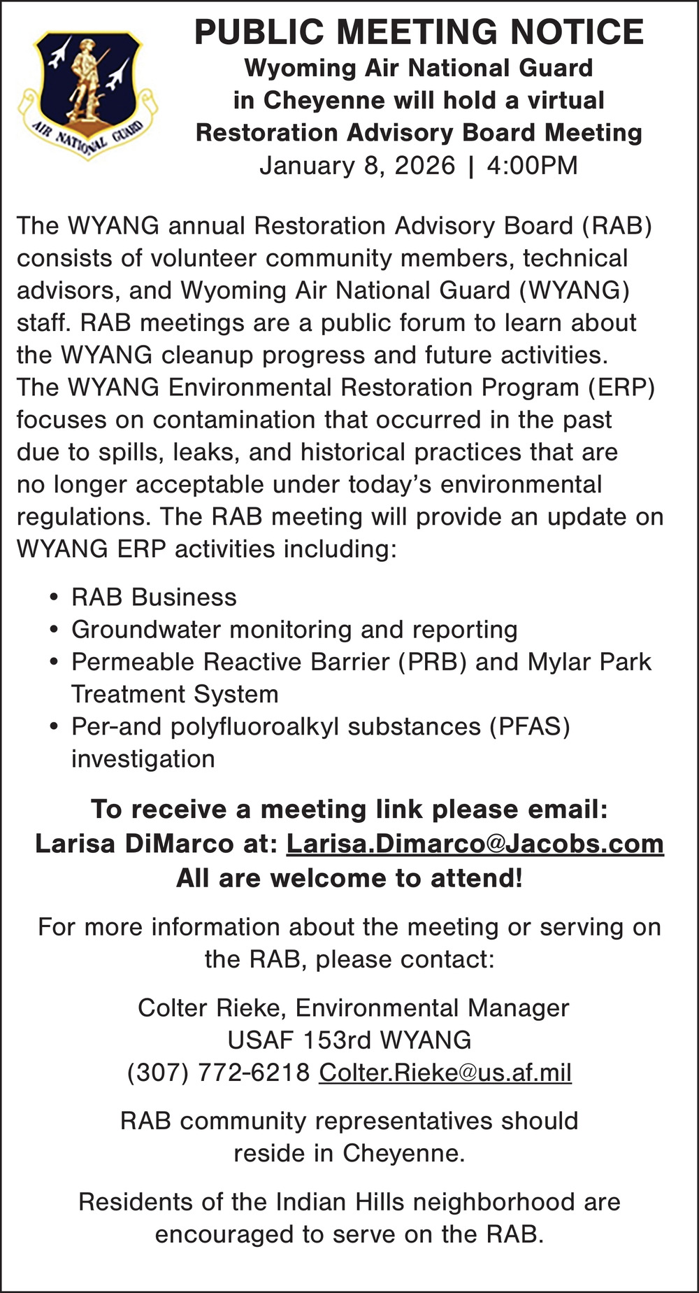 Jan 07, 2026. Wyoming Air National Guard Cheyenne Notice Ads from Wyoming Tribune Eagle