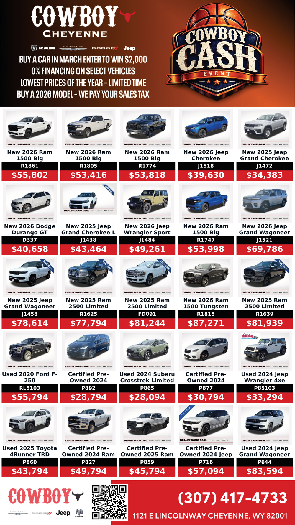 Mar 13, 2026. Cowboy Dodge Chrysler Jeep RAM Auto Dealers Ads from Wyoming Tribune Eagle