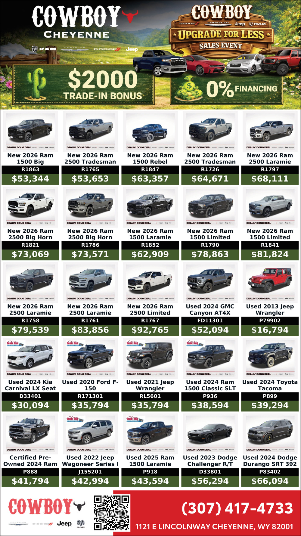 Apr 08, 2026. Cowboy Dodge Chrysler Jeep RAM Auto Dealers Ads from Wyoming Tribune Eagle