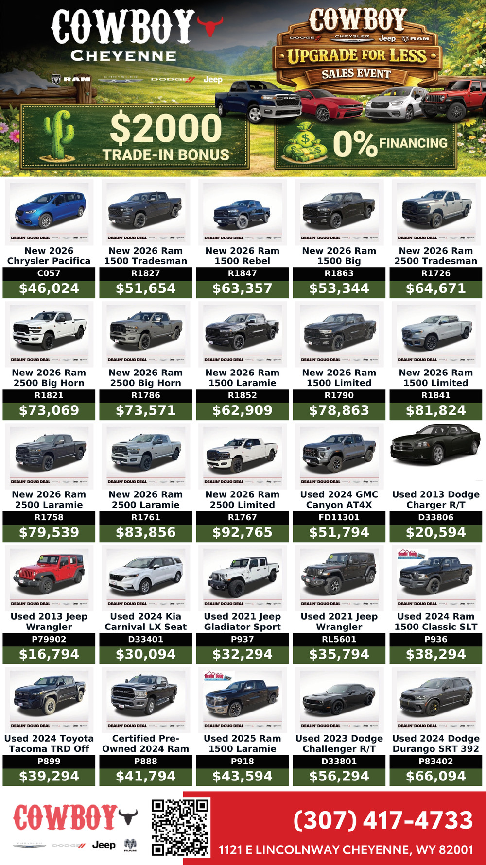 307-240-81161121 E LincolnwayCheyenne, WY 82001(Cowboy Dodge Chrysler Jeep RAM)