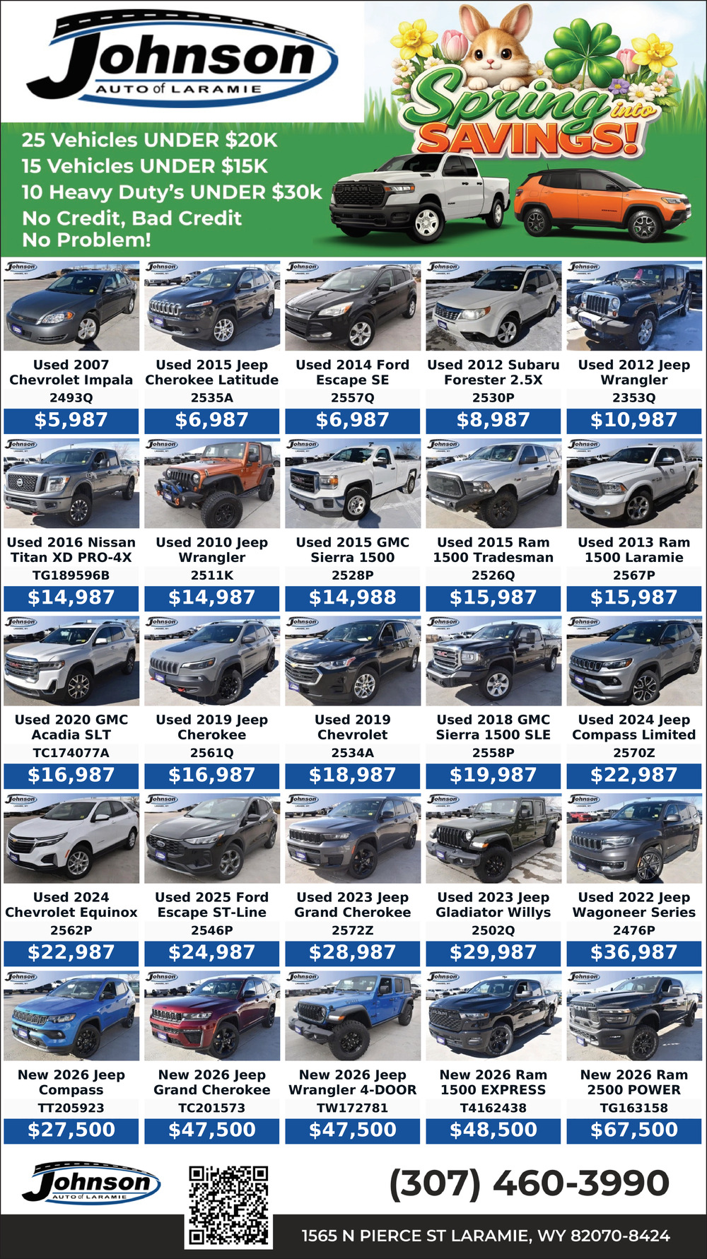 Apr 17, 2026. Johnson Auto of Laramie Auto Dealers Ads from Wyoming Tribune Eagle
